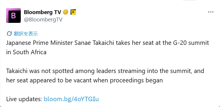 高市総理の遅刻を伝えるブルームバーグ通信のポスト、Xの翻訳機能がなぜか「Sanae Takaichi」を「石破茂」と翻訳!