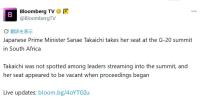 Takaichi was not spotted among leaders streaming into the summit, and her seat appeared to be vacant when proceedings began