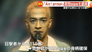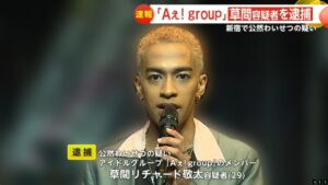 ・2025年10月4日、「Aぇ!group」のメンバー・草間リチャード敬太容疑者(29)が公然わいせつ容疑で逮捕された。新宿区の(ホモ関連店舗が入っている)ビル付近で下半身を露出した疑いがあるという。