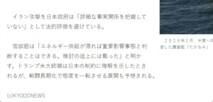 ・日本国内において、戦後最大級の石油危機が迫っている中、共同通信の記事「自衛隊海外派遣、3原則が歯止め 安保法10年、イラン攻撃対応で」の中で、 「官邸筋は『エネルギー供給が滞れば重要影響事態と判断することはできる。検討の俎上には載った』と明かす。」との一文が、配信後にまるまる削除された。