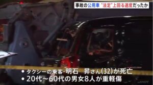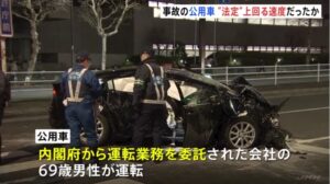 タクシーの乗客で会社員の明石昇さん(32)が死亡し、男女8人(20代~60代)が重軽傷を負いました。公用車は、内閣府から運転業務を委託されている会社の69歳の男性が運転していましたが、その後の捜査関係者への取材で、公用車が法定速度を上回る速度で交差点に進入したとみられることがわかりました。