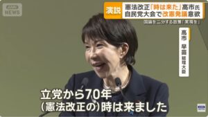 ・2026年4月12日、自民党大会が開催され、高市総理は憲法改悪について「時は来た」と喜びの声を上げた。