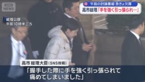 「日曜討論」を“ドタキャン”した高市首相は、自身のXで「実は、ここ数日の遊説会場で、熱烈に支援してくださる方々と握手した際、手を強く引っ張られて痛めてしまいました。 関節リウマチの持病がありまして、手が腫れてしまいました。 急遽医務官の方に来ていただき、お薬を塗っていただき、しっかりテーピングもしていただきました」と説明した。