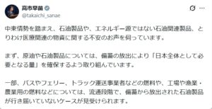 ・2026年3月29日、日本国内の石油危機が深刻化しつつある中、高市総理が自身のXを更新し、長々とした文章を投稿。「ただちに供給が滞ることはないですから、落ち着いた対応をお願い申し上げます」などと繰り返した。