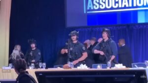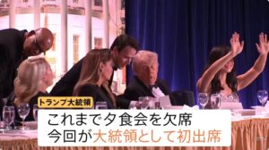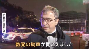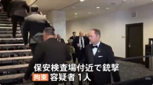 トランプ氏が25日夜、会場で壇上の席に座って歓談していると、午後8時35分(日本時間26日午前9時35分)ごろ、発砲音が聞こえた。警護隊がトランプ氏やバンス氏を壇上から退避させ、参加者らも次々とテーブルの下に身を隠し、会場は騒然とした雰囲気に包まれた。