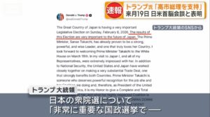 ・高市総理による”奇襲解散総選挙”の投開票が目前に迫った中、トランプ米大統領が高市総理への全面的な支持を表明した。