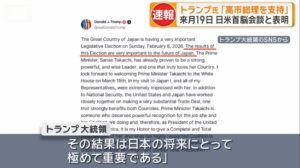 トランプ大統領“3月19日に高市氏と日米首脳会談を予定” 衆議院選挙での高市総理と連立政権への全面支持表明も「彼女は日本国民を決して失望させない」