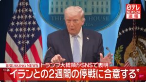イラン情勢をめぐって、トランプ大統領が日本時間・午前7時半すぎ、「イランへの攻撃を2週間停止することに同意した。これは双方による停戦だ」と自らのSNSに投稿。